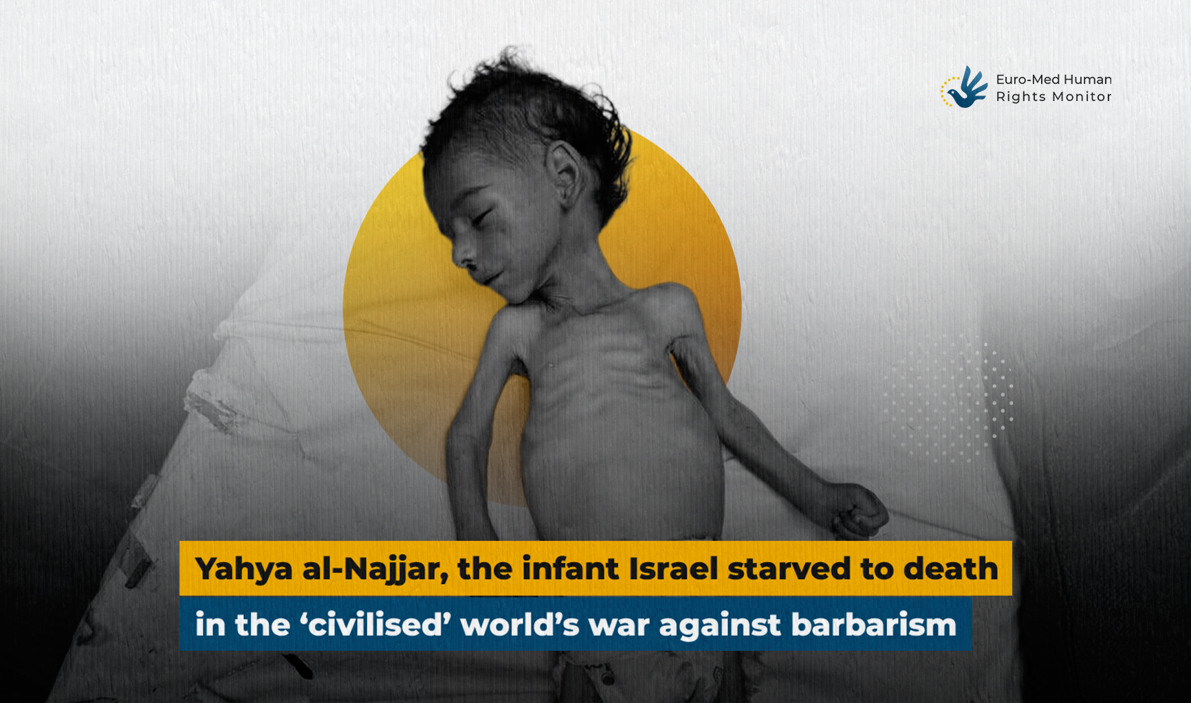 Describing his child’s body, Yahya’s father asked, “What is my child’s fault that he should die of hunger and the lack of children’s supplies in the Gaza Strip? What is his fault?” He continues, “Look how his body has wasted away; look how his skin has stuck to his bones!”